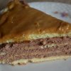 A piskótát két lapba vágom. Az alsót megkenem baracklekvárral, erre kerül a krém kb. fele.