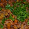 Az olajat és a vajat nagyobb serpenyőben felhevítettem, ebben pirítottam meg az apróra vágott hagymákat és fűszereket.