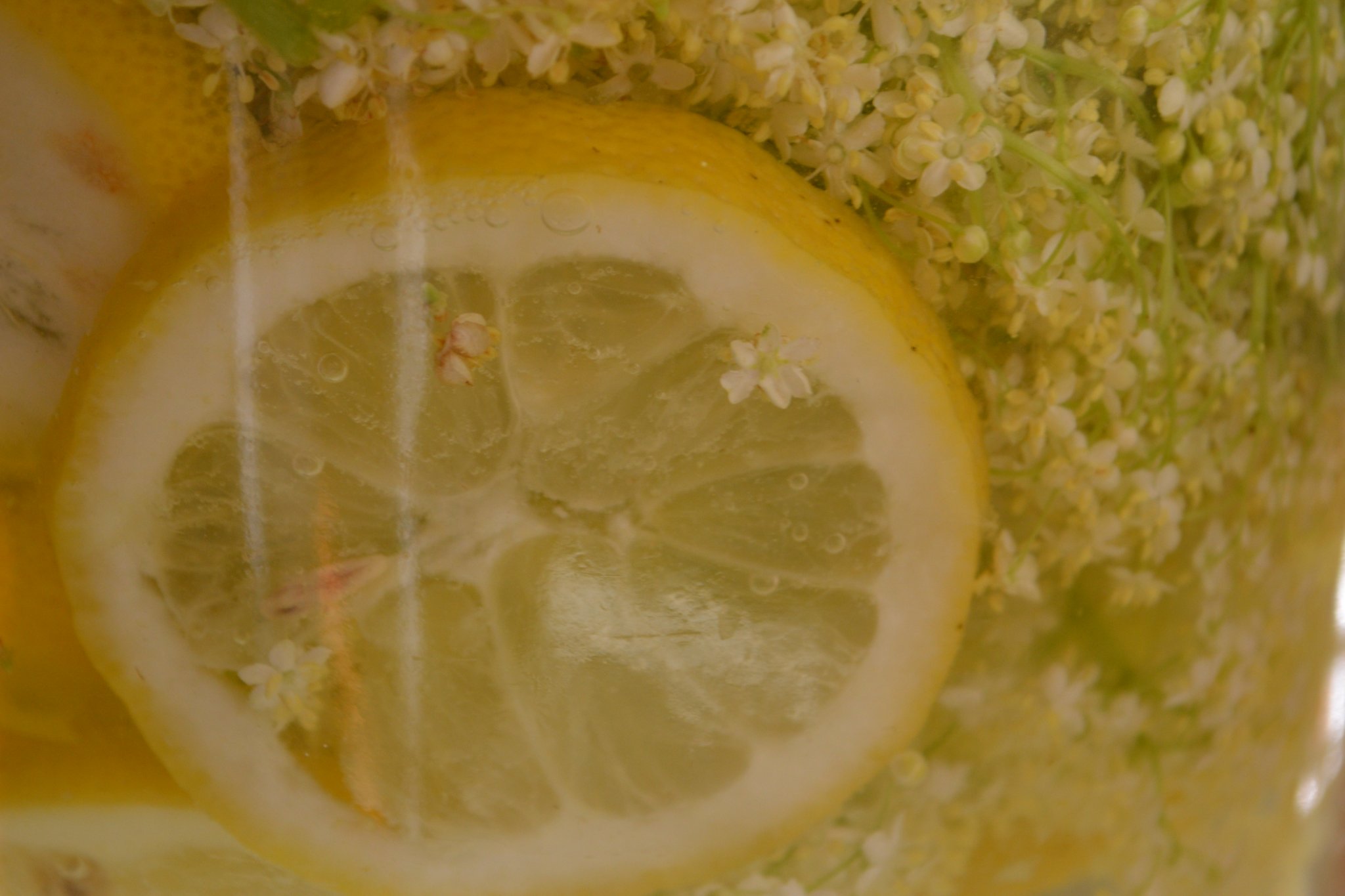 A citromokat egy üveg aljába karikázzuk, beleöntjük a cukrot. A bodzavirágot elhelyezzük benne, majd ráreszeljük a gyömbért.