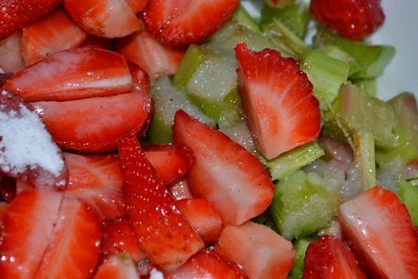 Az epret lecsumázzuk, negyedeljük. A rebarbara héját lehúzzuk és kis darabokra vágjuk (1-2 cm).