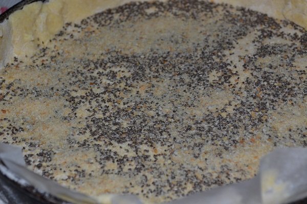 Egy kerek pite vagy tortaformát sütőpapírral kibélelünk, és ebbe tesszük a kinyújtott tésztát.