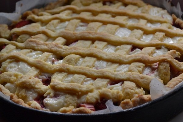 A maradék tésztát kinyújtjuk és felcsíkozzuk a sütőedény méretének megfelelően.