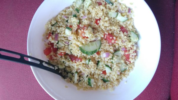 A zöldségeket tetszés szerint felkockázzuk, és a langyos bulgurhoz keverjük. Meglocsoljuk citromlével, sózzuk, borsozzuk, rácsurgatjuk az olajat. Végül petrezselyemzölddel koronázzuk.