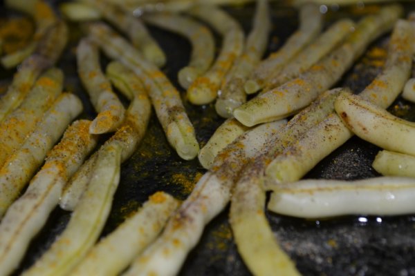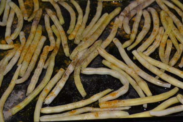 A megtisztított zöldbabot sütőlapra helyezzük.