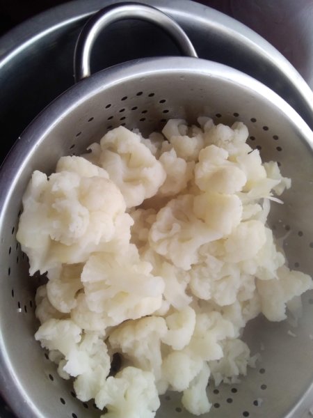 A rózsáira szedett karfiolt sós vízben félpuhára főzzük.
