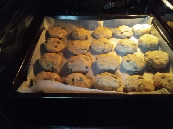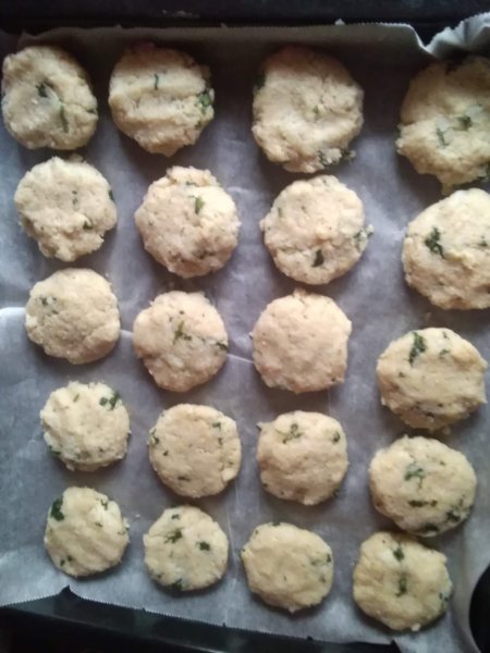 Kis pogácsákat formázunk a pépből, és sütőpapírra helyezzük.