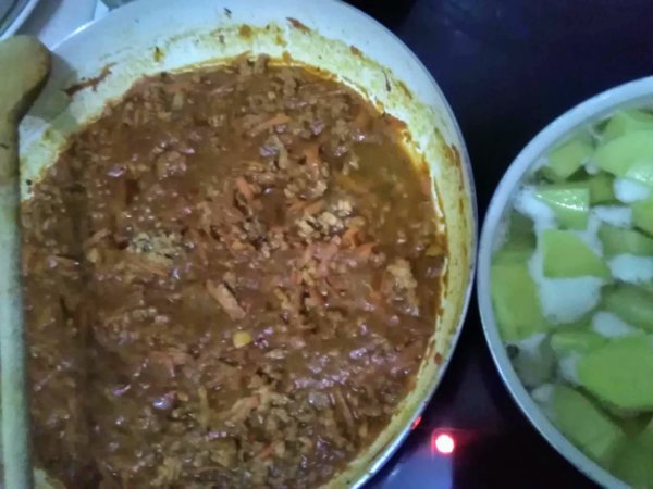Hozzáadjuk a darált húst, a paradicsompürét, az egészet jól átsütjük, sózzuk, borsozzuk.