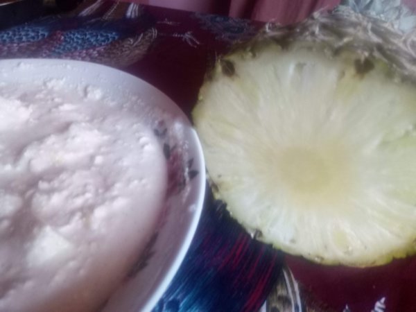A töltelékhez először a túrót villával összetörjük, majd krémessé keverjük az ananász és a tojásfehérje kivételével az összes hozzávalóval.