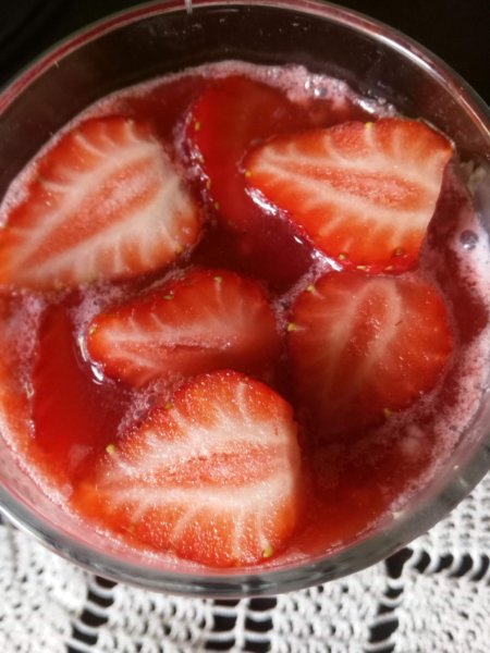Egy átlátszó pohárba teszünk alulra pár szelet epret. Rákanalazzuk a tejes magot. Erre kerül az epervelő, végül megkoronázzuk lecsumázott, félbevágott eperszemekkel.