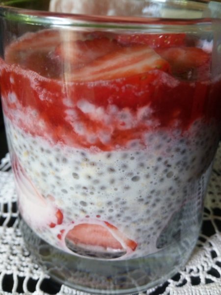 A zabpelyhet és a chia magot egy porcelán tálba öntjük, felöntjük a tejjel. Összekavarjuk, majd betesszük a hűtőszekrénybe 1-2 órára. Félóránként keverünk rajta egyet. Az eper harmadából-feléből epervelőt készítünk. Ez csupán annyit jelent, hogy az epret egy szitán vagy szűrőn átpasszírozzuk, ezzel megszabadítva a magjaitól.