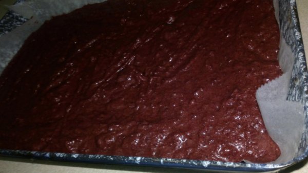 A tojások sárgáját a cukor felével kikeverjük, majd belekeverjük előbb a vajas-narancsos olvasztott csokoládét, majd a céklapürét is.