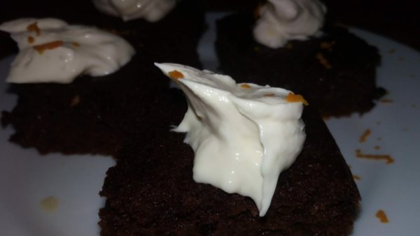 Ezt kikeverjük, a sütemény tetejére halmozzuk, némi reszelt narancshéjjal díszítjük.