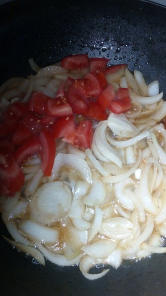 A zsiradékon először a hagymát pirítjuk meg, majd hozzáadjuk a fokhagymát, a paradicsomot és a paprikát is. Csipetnyi sóval ízesítjük.