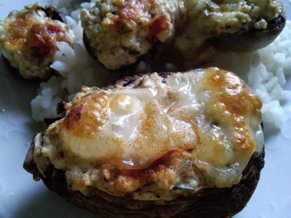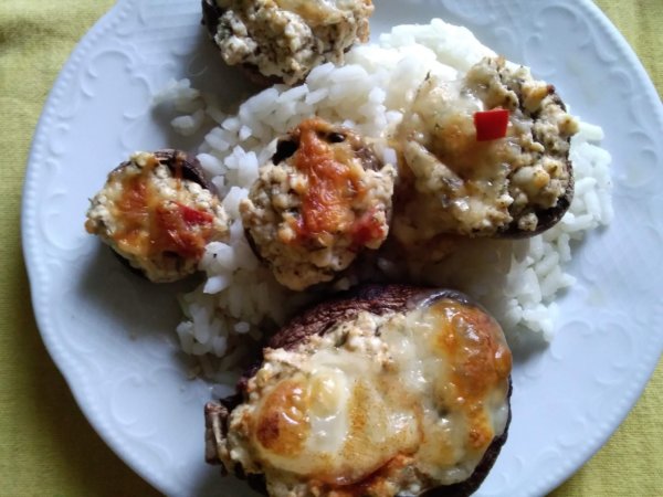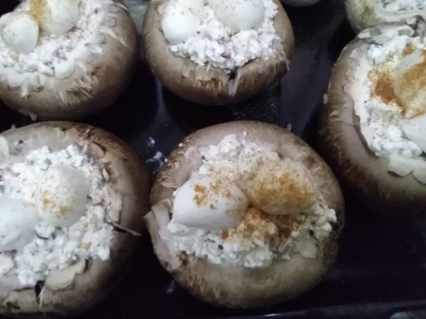 Egy evőkanál segítségével betöltjük a túrókrémet a gombákba, mozzarella sajttal megkoronázzuk. Csilivel megszórjuk.