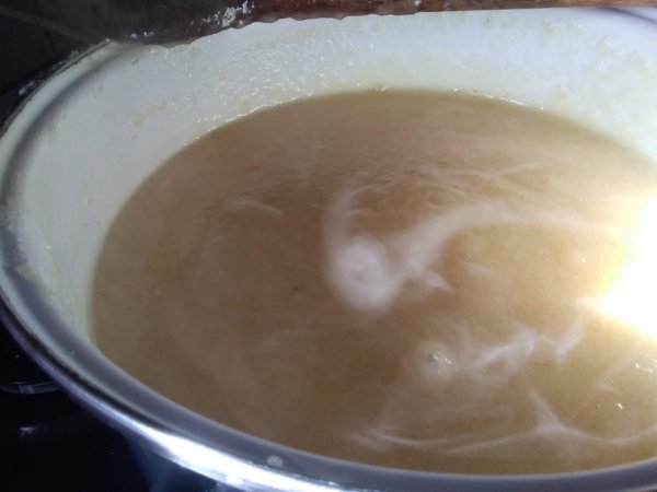 A fahéjat és vaníliarudat beledobjuk a fazékba, a szegfűszeget is, csak azt előzőleg teatojásba gyömöszöljük.